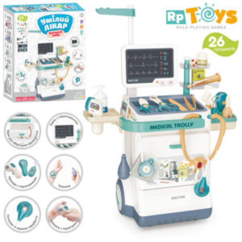Набір лікаря 660-89 (12шт) стіл-возик, 46,5-26,5-в115см, рентген, стетоскоп, мед.інструменти, звук, світло, 26пр, на бат-ці, в кор-ці, 46-38-12,5см