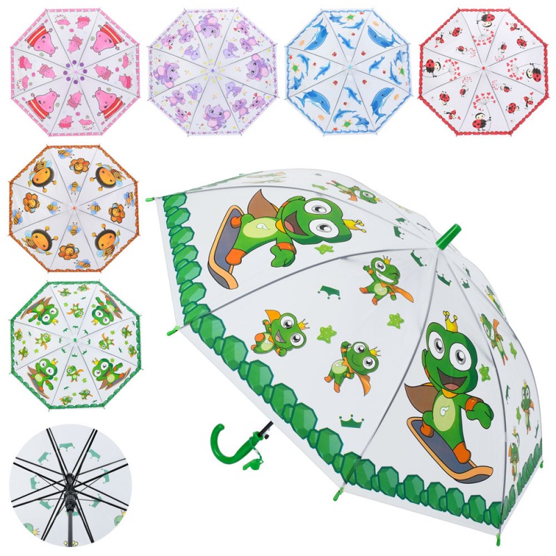 Парасолька дитяча MK 5793 (60шт) довжина 65,5см, тростина 60см, діаметр 84см, спиця 47,5см, клейонка, свисток, 6 видів, у пакеті